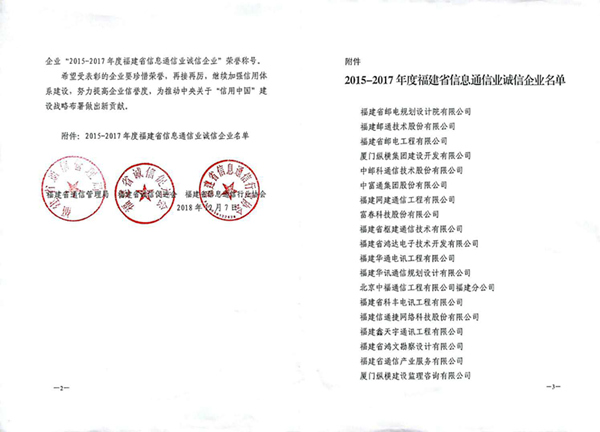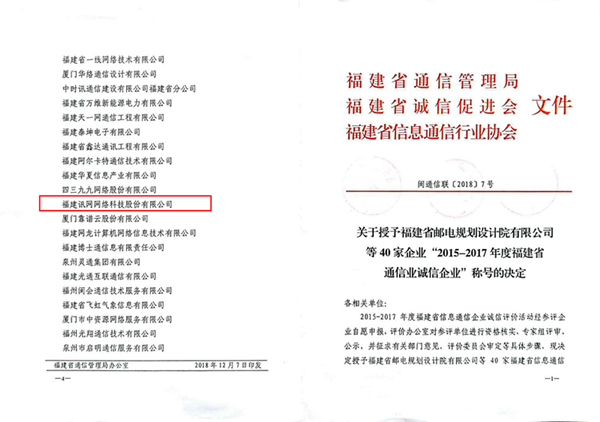12月11日,福建省信息通信行業(yè)協(xié)會(huì)第四屆理事會(huì)第三次會(huì)議暨2015-2017年度福建省信息通信業(yè)誠(chéng)信企業(yè)”表彰儀式在福州召開(kāi),福建訊網(wǎng)網(wǎng)絡(luò)科技股份有限公司(簡(jiǎn)稱(chēng)“訊網(wǎng)網(wǎng)絡(luò)”)繼榮獲“2012-2014年度福建省通信業(yè)誠(chéng)信企業(yè)”后,再次榮獲此殊榮。
