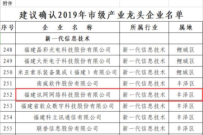 據(jù)泉州市工業(yè)和信息化局發(fā)布的名單公告中,共確認(rèn)310家企業(yè)為2019年市級(jí)產(chǎn)業(yè)龍頭企業(yè),福建訊網(wǎng)網(wǎng)絡(luò)科技股份有限公司(以下簡(jiǎn)稱(chēng)“訊網(wǎng)網(wǎng)絡(luò)”)入選“新一代信息技術(shù)”行業(yè)領(lǐng)域龍頭企業(yè)。