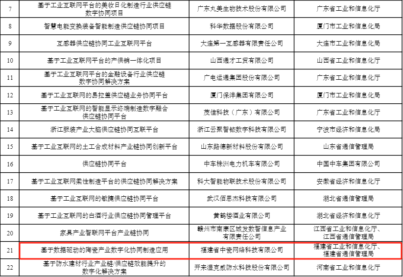 日前,工信部發(fā)布了2023年工業(yè)互聯(lián)網試點示范名單,愛陶瓷平臺(中瓷網絡)憑借“基于數(shù)據(jù)驅動的陶瓷產業(yè)數(shù)字化協(xié)同制造應用”成功入選工業(yè)互聯(lián)網平臺+產業(yè)鏈/供應鏈協(xié)同試點示范,祝賀!